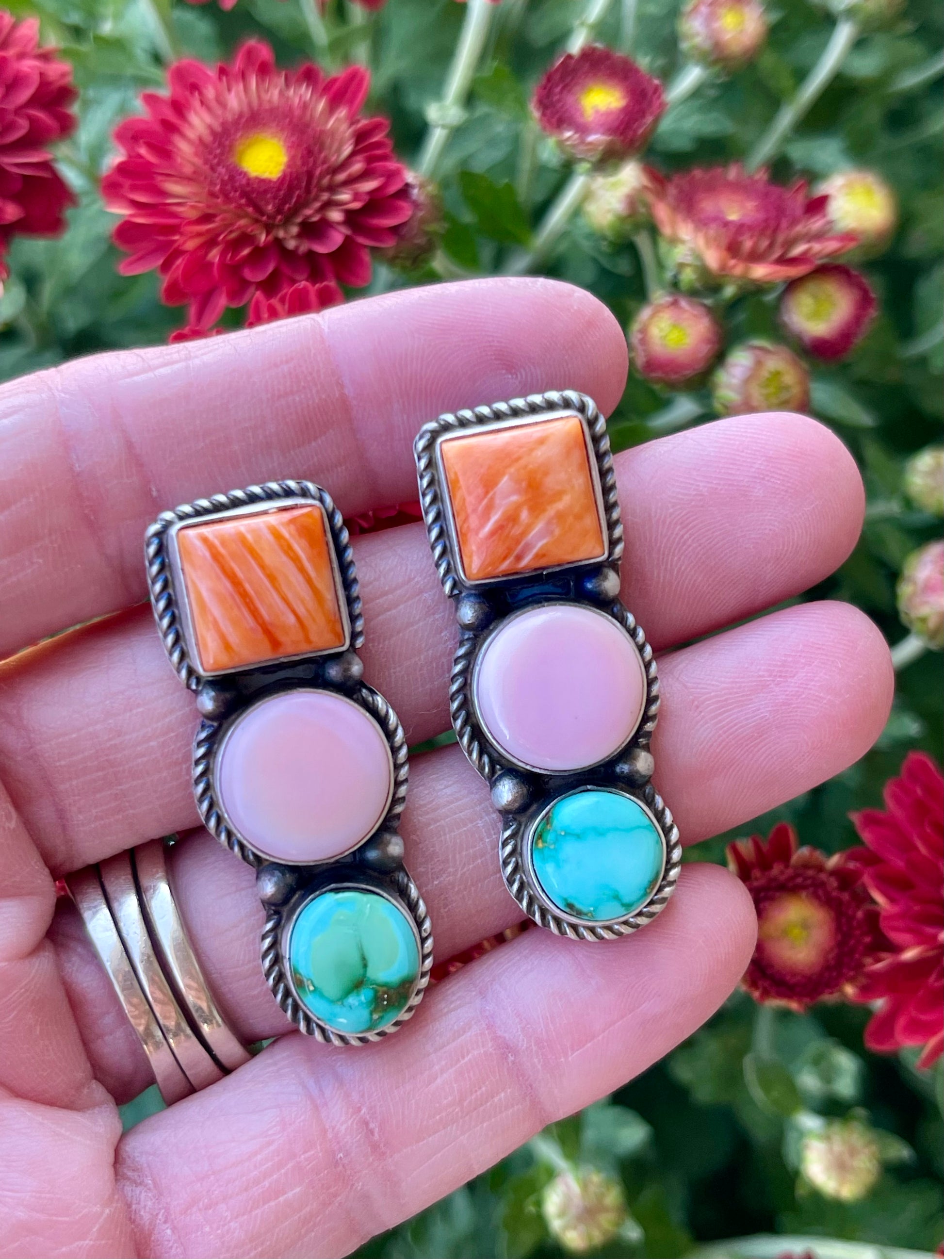 Spiny Oyster, Pink Conch & Sonoran Turquoise 3 Stone Earrings